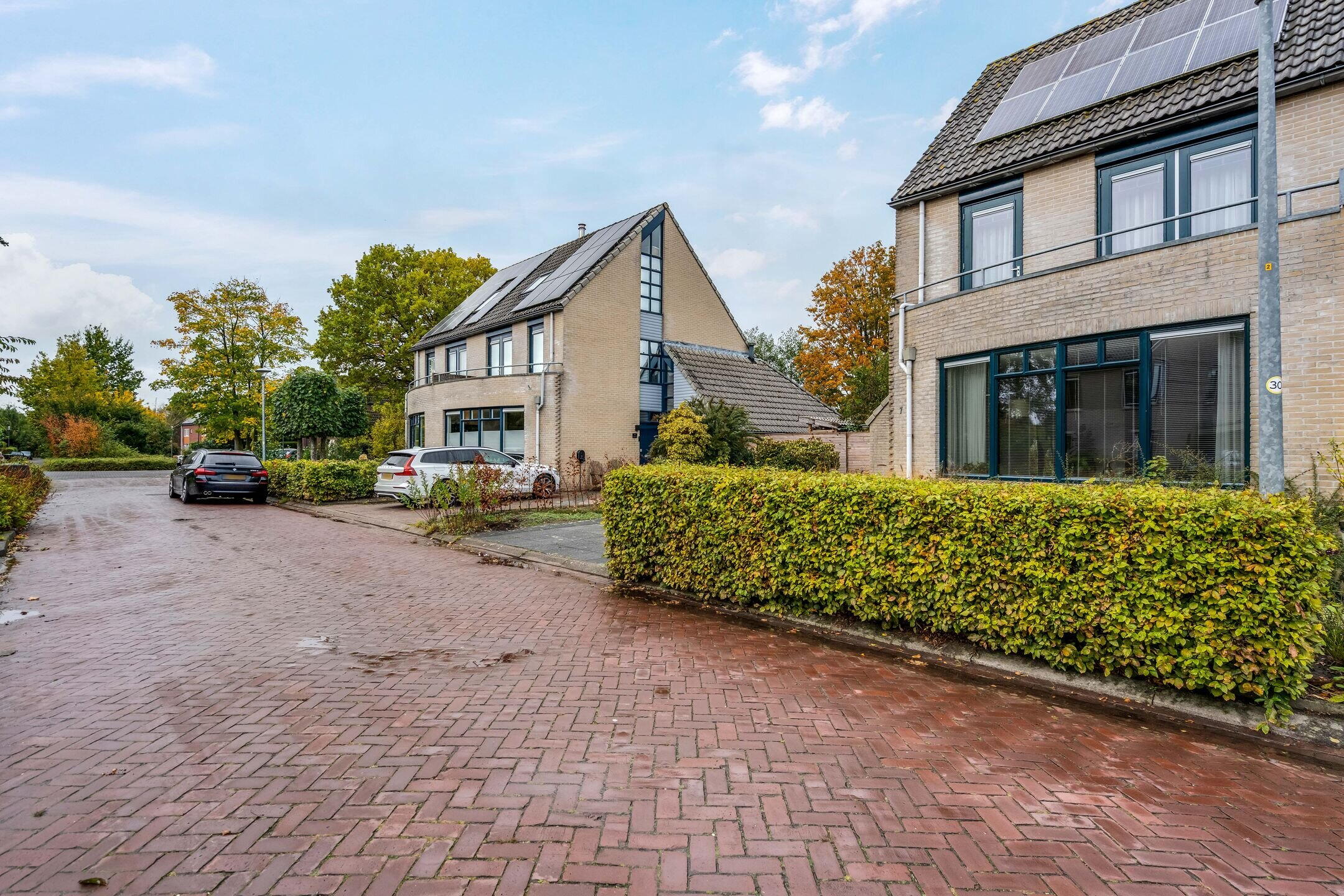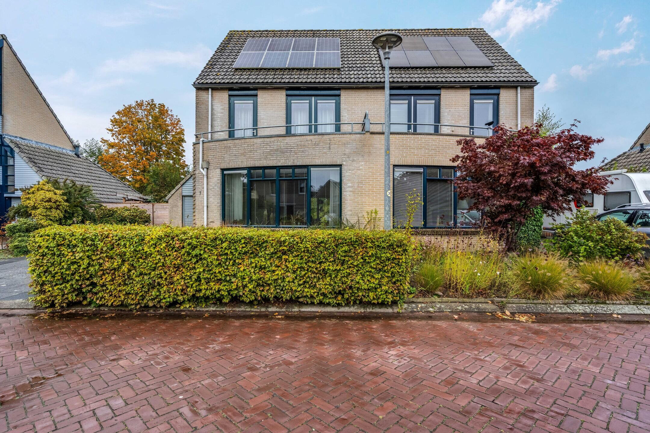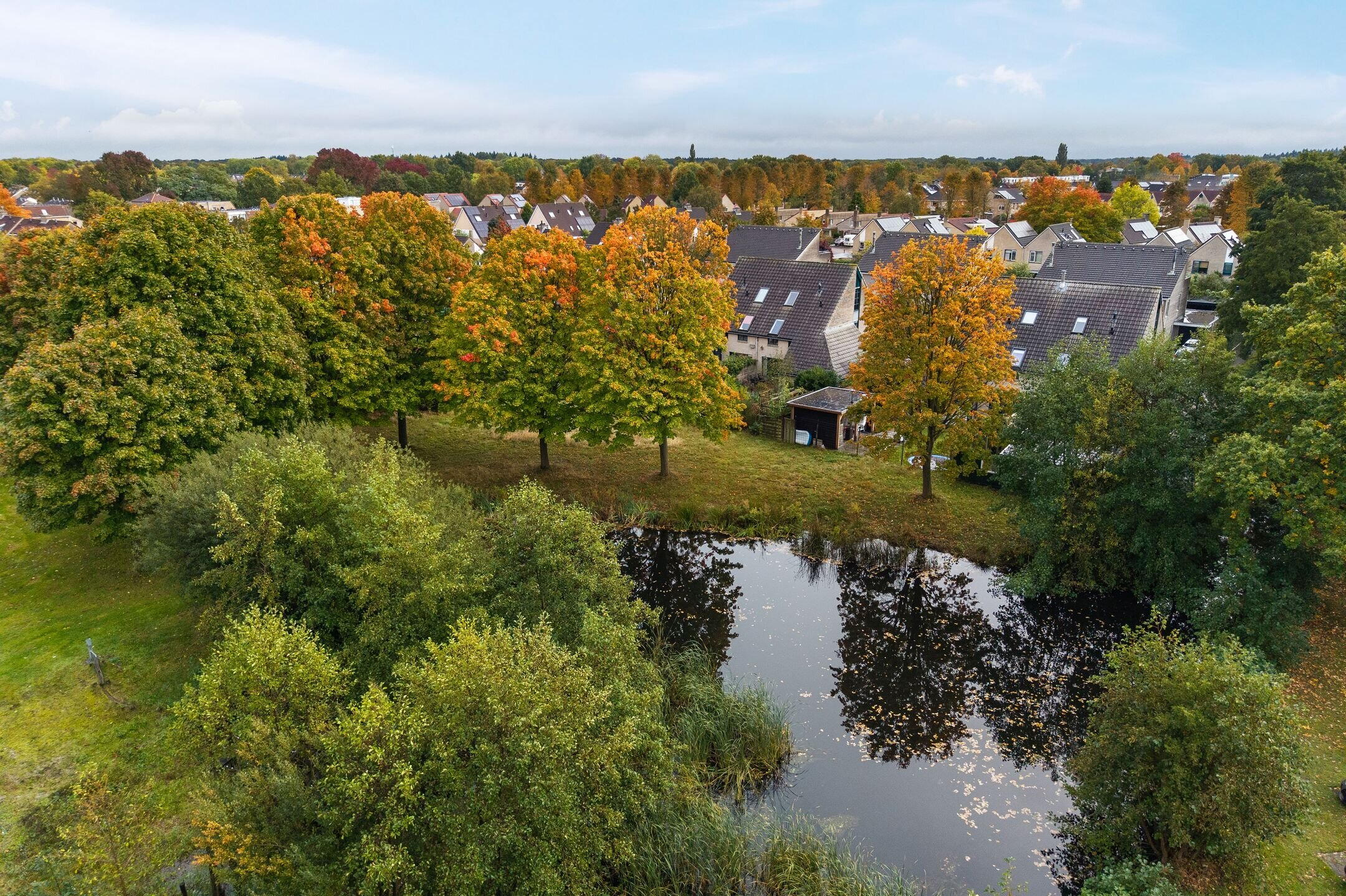 Aan een rustige, autoluwe straat en grenzend aan openbaar groen met een grote vijverpartij ligt deze fraaie en ruime extra verduurzaamde twee-onder-een-kapwoning met inpandige garage.