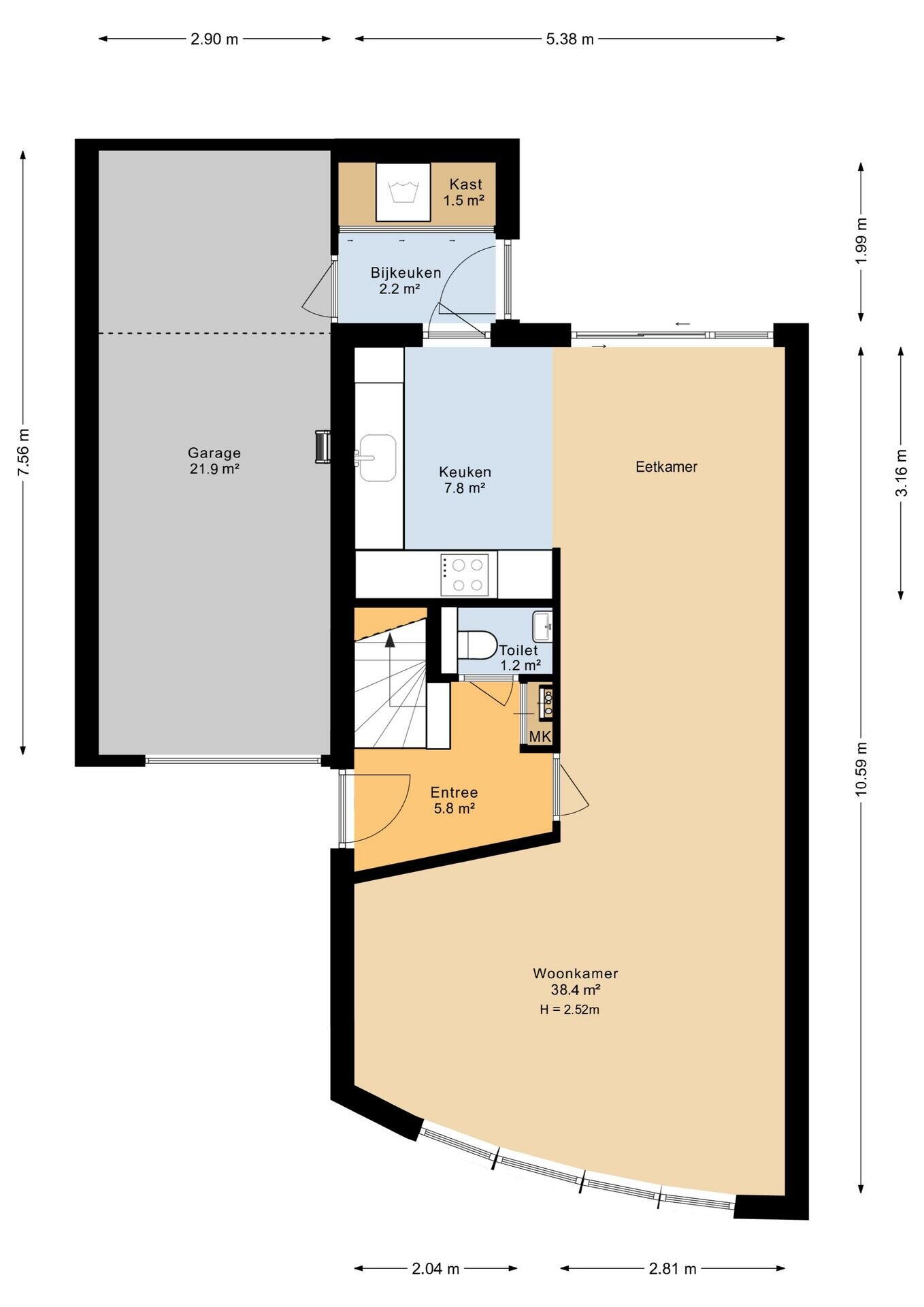 Ruime hal/entree, toilet, L-vormige woonkamer met schuifpui naar de tuin en open keuken (samen ca. 46 m²), bijkeuken met achterdeur en toegang tot de grote inpandige garage voorzien van bergzolder en royale voorraadkast.